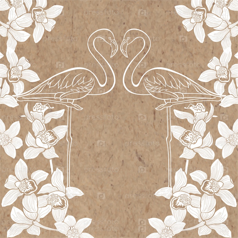 Тропический фон с фламинго и орхидеями на крафт-бумаге. Может быть открытка, приглашение, элемент дизайна