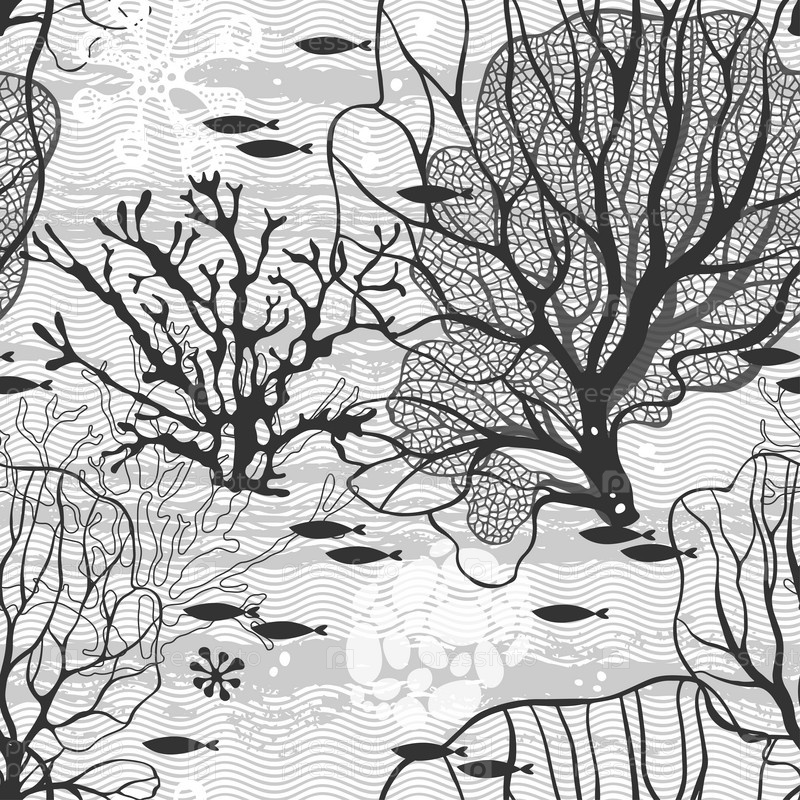 Подводный мир. Бесшовный векторный рисунок с морскими растениями и рыбой
