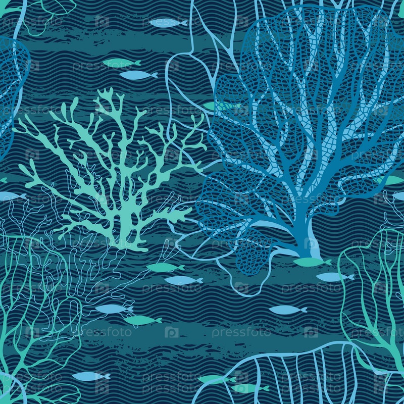 Подводный мир. Бесшовный векторный рисунок с морскими растениями и рыбой
