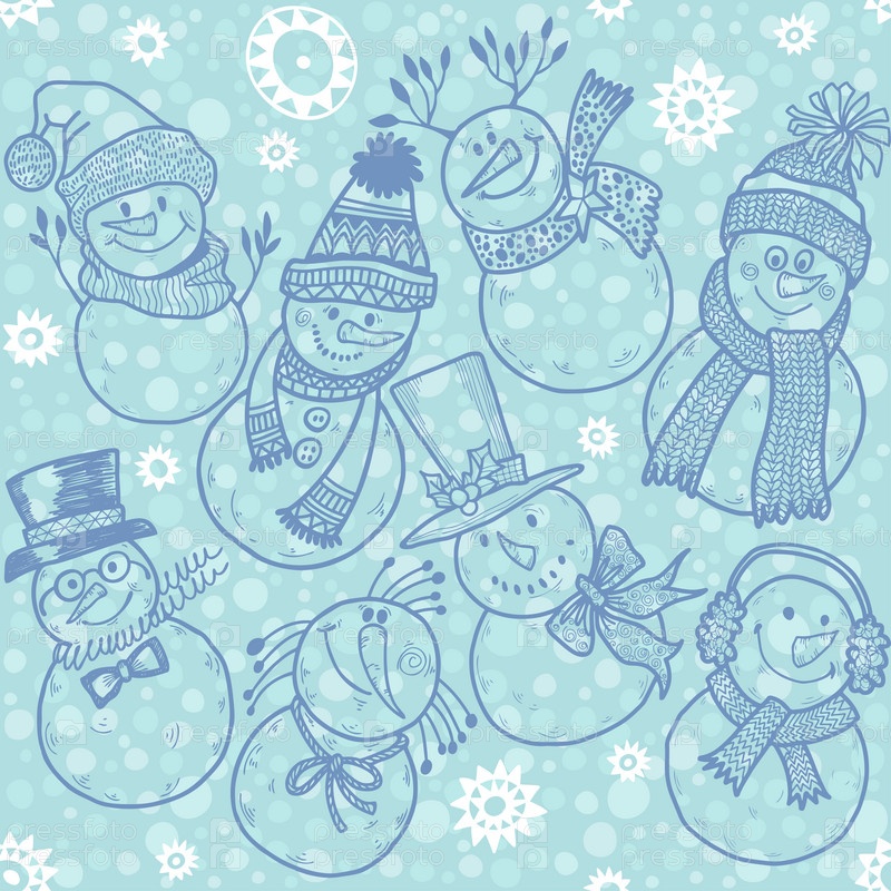 Бесшовный рисунок с милыми мультяшными снеговиками. Векторная иллюстрация, зимний фон