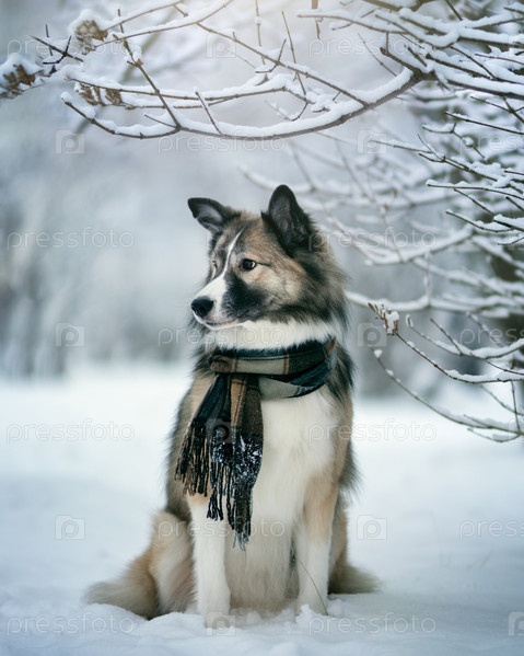 Собака в шарфе в зимнем парке
