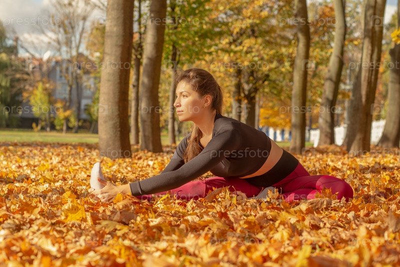 Стройная спортивная женщина растягивается в осеннем городском парке