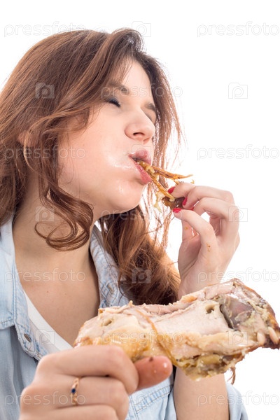 Женщина ест жареную курицу