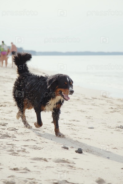 Собака гуляет по пляжу