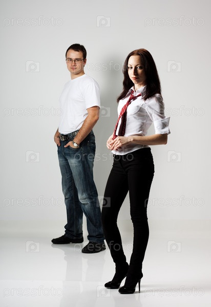 Молодая супружеская пара позирует стоя в студии