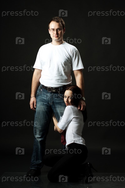 Молодая семья позирует стоя в студии на черном фоне