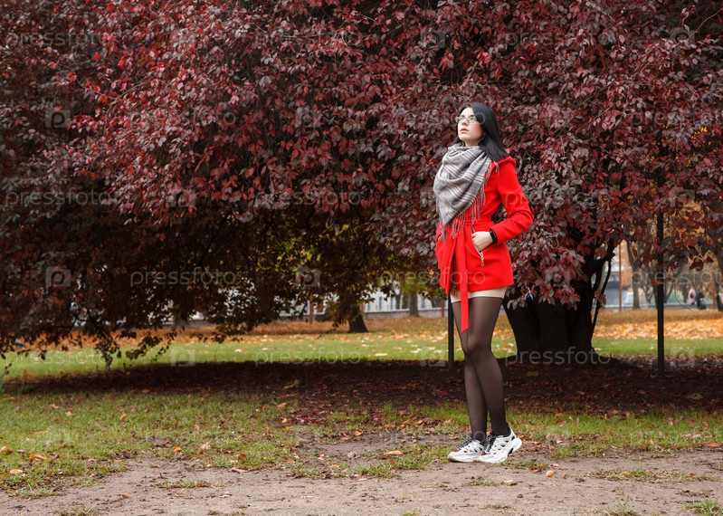 Молодая девушка в красном пальто стоит на аллее