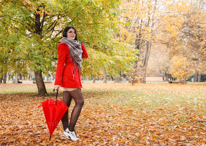 Молодая девушка в красном пальто с зонтиком стоит на аллее