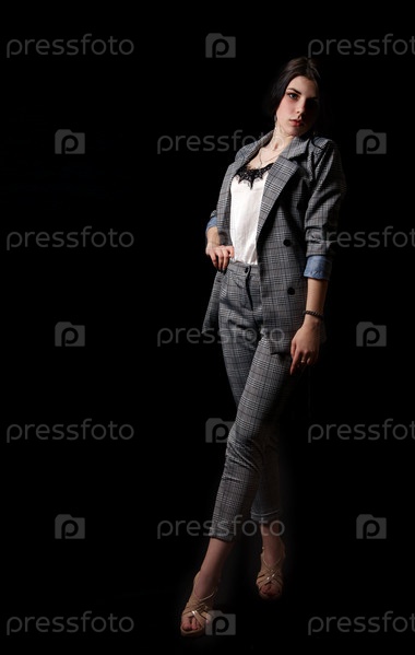 Молодая красивая девушка в деловом костюме позирует стоя в студии на черном фоне