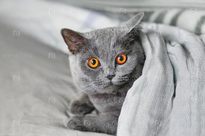 Симпатичная серая кошка британской породы лежит в постели под одеялом. Пушистый питомец в уютном доме