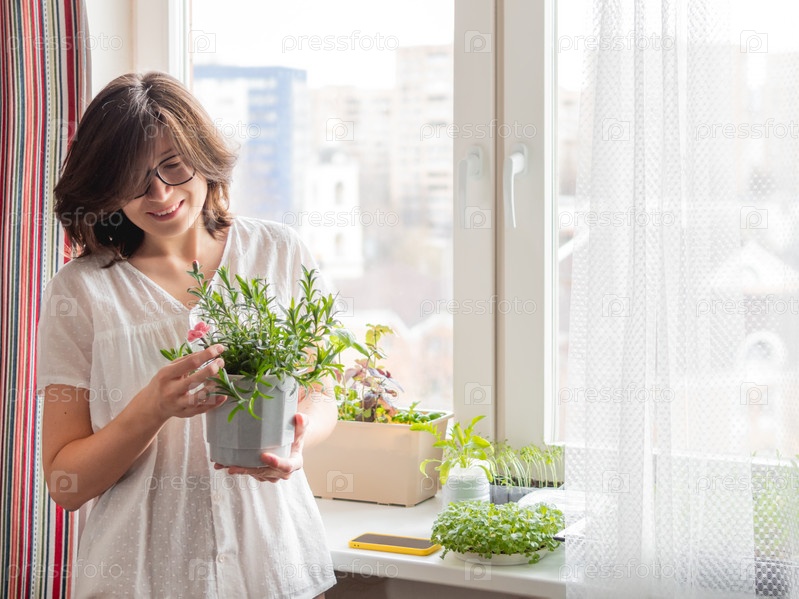 Улыбающаяся женщина смотрит на цветущий цветок гвоздики. Выращивание съедобного органического базилика, рукколы, микрозелени капусты для здорового питания. Озеленение дома на подоконнике