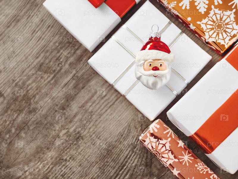 Вид сверху на рождественские подарки на ветхом деревянном фоне с копией пространства. Декоративный Санта-Клаус на новогодних подарках в диагональной композиции на деревянном столе