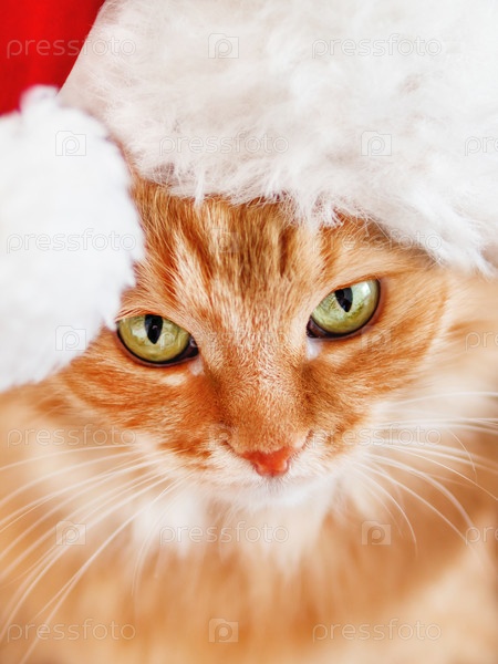 Крупным планом портрет милой рыжей кошки в шляпе Санта-Клауса. Пушистый питомец смотрит в камеру. Празднование Рождества или Нового года. Праздничная открытка