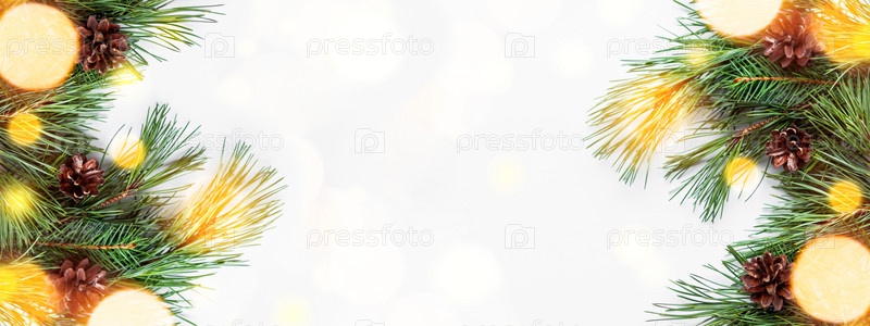 Горизонтальный баннер с ветвями и шишками сосны. Скопируйте пространство на белом фоне с ветвями хвойных деревьев и лампочками. Праздничный баннер для празднования Рождества и Нового года