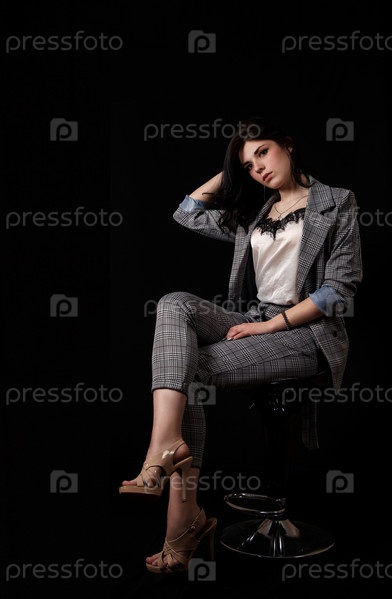 Молодая красивая девушка в деловом костюме позирует сидя на стуле в студии на черном фоне