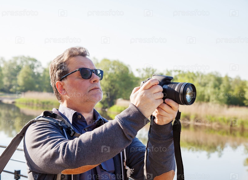 Пожилой мужчина фотографирует реку