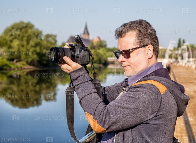 Пожилой мужчина фотографирует пейзаж