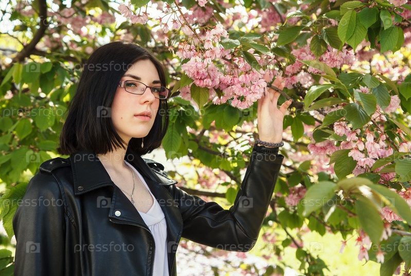 Портрет молодой красивой брюнетки в черной куртке, стоящей возле цветущей сакуры в солнечный весенний день. открытый крупным планом