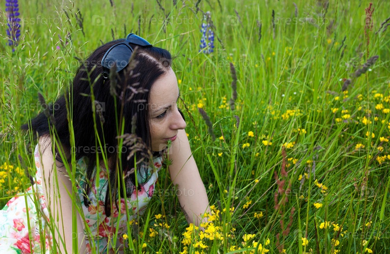 Молодая женщина лежит на траве