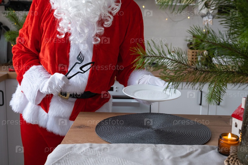 Санта-Клаус накрывает стол дома на белой кухне, ставит тарелку, кладет столовые приборы, вилку и нож. Подготовка к празднованию Рождества, сервировка стола для гостей