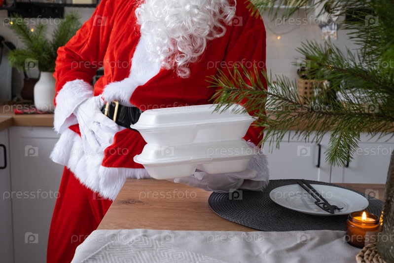 Доставка еды в контейнеры для обслуживания на дому в руках Санта-Клауса кладет ее на кухонный стол и забирает. Готовый горячий заказ, питание на новогодние и рождественские праздники