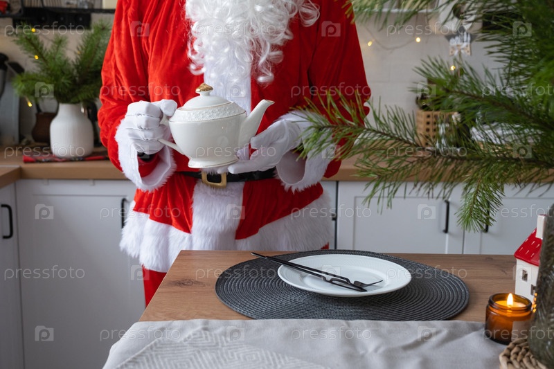 Санта-Клаус накрывает стол дома на белой кухне, ставит тарелку, кладет столовые приборы, вилку и нож. Подготовка к празднованию Рождества, сервировка стола для гостей