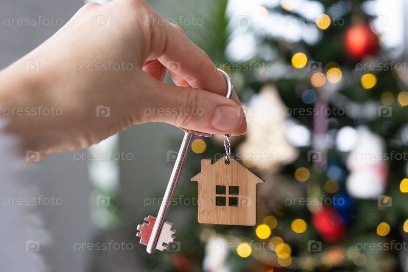 Ключ от дома в руке на фоне елки. Подарок на Новый год, Рождество. Строительство, дизайн, проект, переезд в новый дом, ипотека, аренда и покупка недвижимости. Копировать пространство