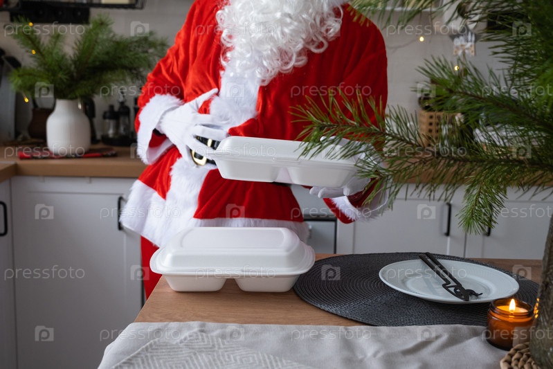 Доставка еды в контейнеры для обслуживания на дому в руках Санта-Клауса кладет ее на кухонный стол и забирает. Готовый горячий заказ, питание на новогодние и рождественские праздники
