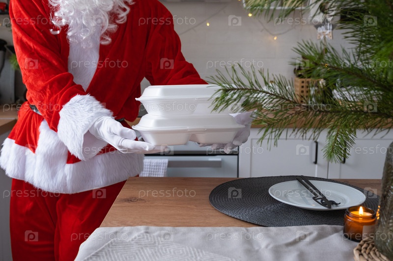 Доставка еды в контейнеры для обслуживания на дому в руках Санта-Клауса кладет ее на кухонный стол и забирает. Готовый горячий заказ, питание на новогодние и рождественские праздники