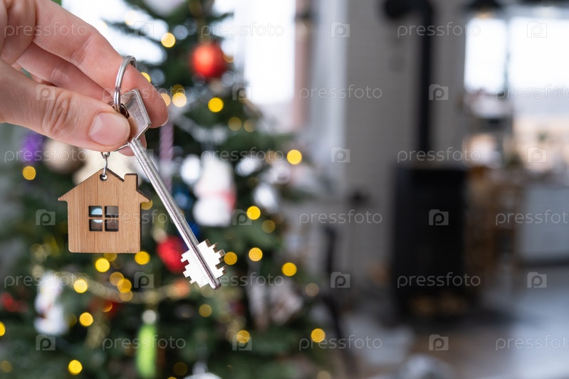Ключ от дома в руке на фоне елки. Подарок на Новый год, Рождество. Строительство, дизайн, проект, переезд в новый дом, ипотека, аренда и покупка недвижимости. Копировать пространство