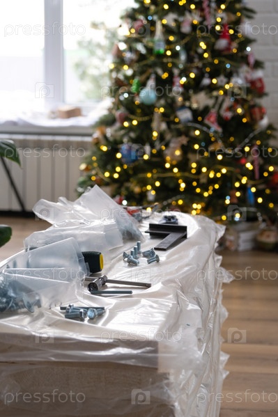 Строительные материалы с инструментами для ремонта дома на фоне елки - декоративный ремонт и строительство к новому году