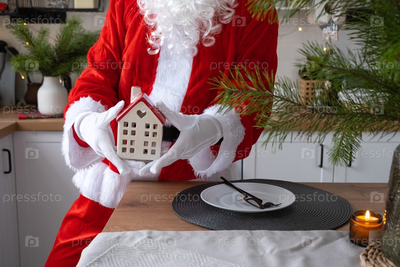 Ключ от дома с брелком в руках Санта-Клауса на открытом воздухе в снегу. Сделки с недвижимостью, покупка, строительство, переезд, ипотека. Уютный дом. С Рождеством, новогодним бронированием и залом