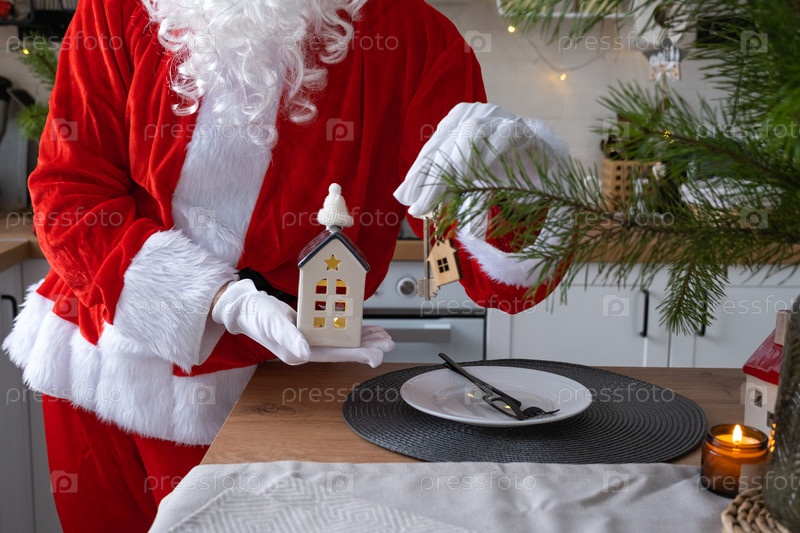 Ключ от дома с брелком в руках Санта-Клауса на открытом воздухе в снегу. Сделки с недвижимостью, покупка, строительство, переезд, ипотека. Уютный дом. С Рождеством, новогодним бронированием и залом