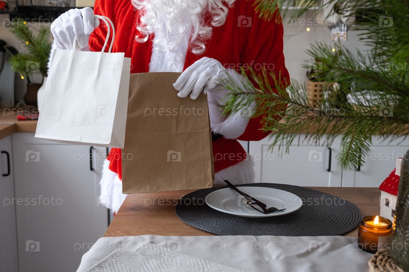 Дед Мороз ставит его на кухонный стол и забирает бумажные пакеты с подарком, домашней выпечкой и доставкой еды. Шопинг, переработка упаковки, хендмейд, доставка на Рождество и Новый год