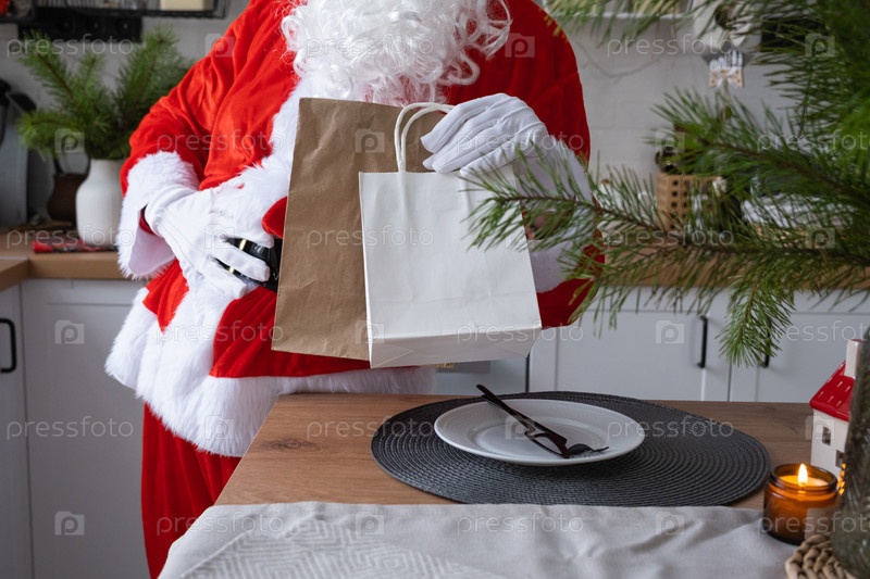Дед Мороз ставит его на кухонный стол и забирает бумажные пакеты с подарком, домашней выпечкой и доставкой еды. Шопинг, переработка упаковки, хендмейд, доставка на Рождество и Новый год
