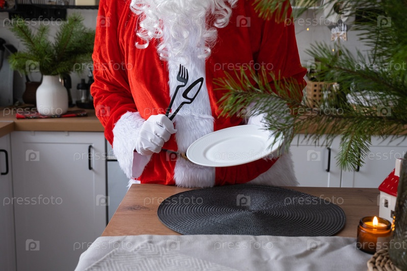 Санта-Клаус накрывает стол дома на белой кухне, ставит тарелку, кладет столовые приборы, вилку и нож. Подготовка к празднованию Рождества, сервировка стола для гостей