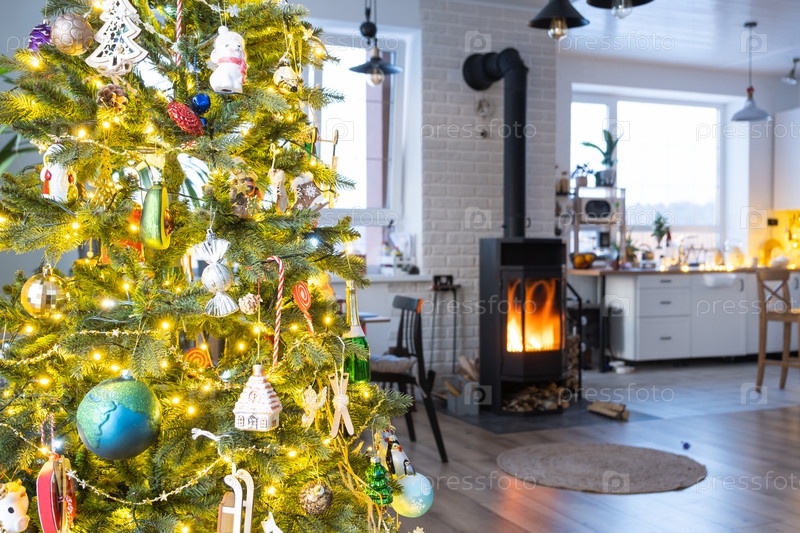 Праздничный интерьер дома украшен к Рождеству и Новому году в стиле лофт с черной печкой, камином, елкой. Теплая комната-студия с накрытым столом, горящим деревом, уютом и отоплением дома