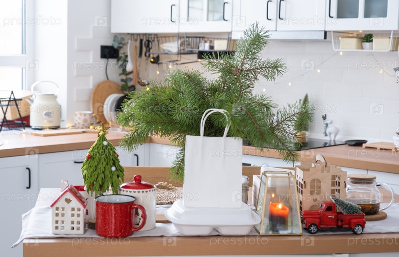 Контейнеры службы доставки еды на столе в белой кухне, празднично поданные для празднования Рождества и Нового года. Экономия времени, горячий заказ, одноразовая пластиковая коробка, ремесленная упаковка. макет