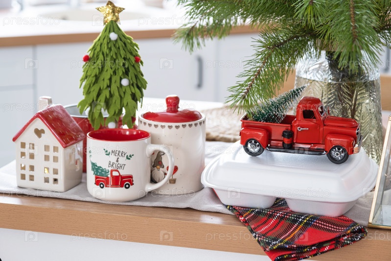 Контейнеры службы доставки еды на столе в белой кухне, празднично поданные для празднования Рождества и Нового года. Экономия времени, горячий заказ, одноразовая пластиковая коробка, ремесленная упаковка. макет