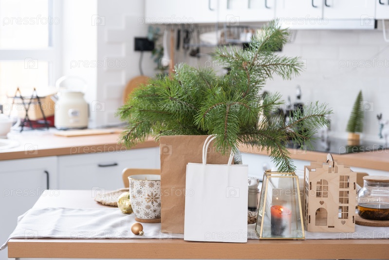 Макет бумажных пакетов стоит на кухонном столе, украшенном к Рождеству. Покупки и подарки, подарки и готовые блюда доставлены и приготовлены к Новому году
