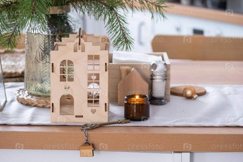 Ключ от дома в уютном доме с рождественским декором на столе праздничной кухни. Подарок на Новый год. Строительство, дизайн, проект, переезд в новый дом, ипотека, аренда и покупка недвижимости