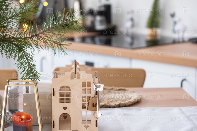 Ключ от дома в уютном доме с рождественским декором на столе праздничной кухни. Подарок на Новый год. Строительство, дизайн, проект, переезд в новый дом, ипотека, аренда и покупка недвижимости
