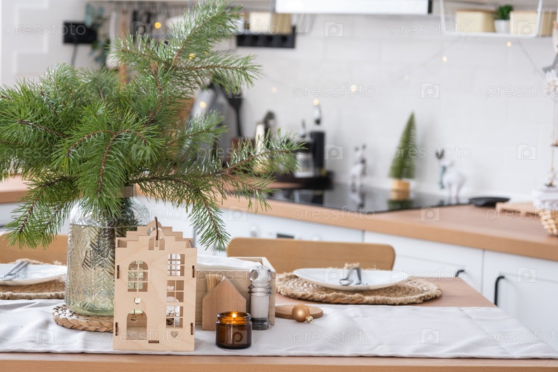 Праздничный рождественский декор в белой кухне, праздничный завтрак, белый скандинавский интерьер. Фигура уютного домика на накрытом столе. Новый год, настроение, уютный дом. Копировать пространство