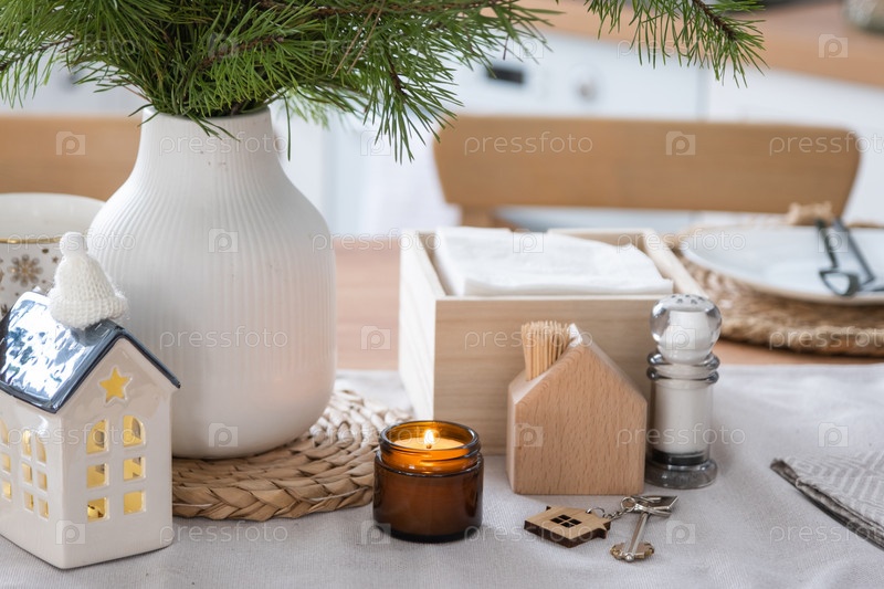 Ключ от дома в уютном доме с рождественским декором на столе праздничной кухни. Подарок на Новый год. Строительство, дизайн, проект, переезд в новый дом, ипотека, аренда и покупка недвижимости