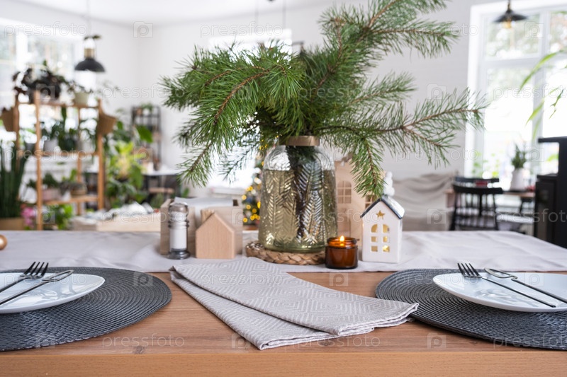 Праздничный рождественский декор в белой кухне, праздничный завтрак, белый скандинавский интерьер. Фигура уютного домика на накрытом столе. Новый год, настроение, уютный дом. Копировать пространство