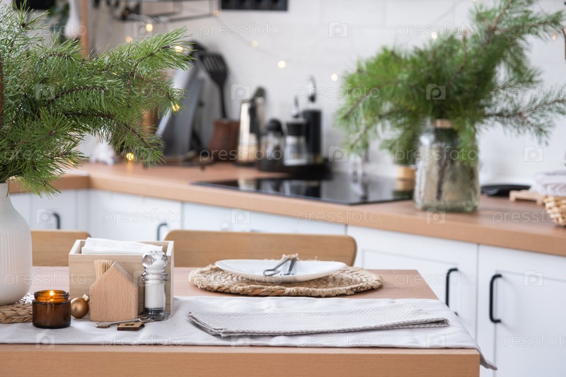 Праздничный рождественский декор в белой кухне, праздничный завтрак, белый скандинавский интерьер. Фигура уютного домика на накрытом столе. Новый год, настроение, уютный дом. Копировать пространство