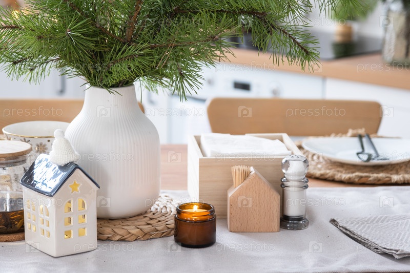 Праздничный рождественский декор в белой кухне, праздничный завтрак, белый скандинавский интерьер. Фигура уютного домика на накрытом столе. Новый год, настроение, уютный дом. Копировать пространство