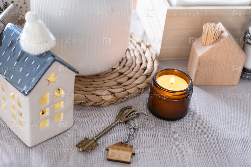 Ключ от дома в уютном доме с рождественским декором на столе праздничной кухни. Подарок на Новый год. Строительство, дизайн, проект, переезд в новый дом, ипотека, аренда и покупка недвижимости