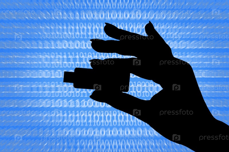 Силуэт руки, держащей флешку на абстрактном цифровом фоне. Концепция кражи данных, защита данных, компьютерный взлом