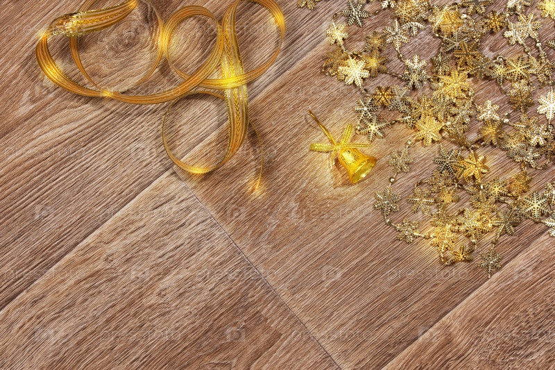 Новогодний абстрактный фон в золотых тонах со снежинками, лентой и колокольчиком на деревянном фоне. Открытка